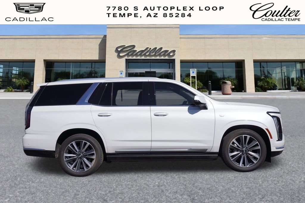 Experience The Difference At Coulter Tempe. Tempe Autoplex - i-10 and Elliot Road. Proud to be part of the Coulter Automotive Group - serving Phoenix since 1923. The Cadillac Escalade is equipped with Preferred Equipment Group 1SB (2-Speed Active Transfer Case, AKG Studio 19-Speaker Audio System, Blind Zone Steering Assist with Trailering, Door Lock and Latch Shields, Electronic Limited-Slip Differential, Glass Breakage Sensor, Heated and Ventilated Driver and Front Passenger Seats, Hitch Guidance with Hitch View, Illuminating Front and Rear Sill Plates, Integrated Trailer Brake Controller, Magnetic Ride Control Suspension, Power Panoramic Tilt-Sliding Sunroof, Reconfigurable Full-Color Head-Up Display, Running Board Assist Steps, Smart Trailer Integration Indicator, Theft-Deterrent Alarm System, Trailering App, Trailering Assist Guidelines, Vehicle Inclination Sensor, Vehicle Interior Movement Sensor, Wheel Locks, and Wheels: 22 9-Spoke Alloy with Polished Finish), Touring Package (Air Ride Adaptive Suspension, Power Open/Close Doors, and Soft Closing Front and Rear Doors), 4WD, Black Leather, 19 Speakers, 2-Presets Memory For Driver Seat Adjuster, 3.23 Axle Ratio, 3rd row seats: split-bench, 4-Way Power Driver Lumbar Seat Adjuster, 4-Way Power Front Passenger Lumbar Seat Adjuster, 4-Wheel Disc Brakes, 8-Way Power Driver Seat Adjuster, 8-Way Power Front Passenger Seat Adjuster, ABS brakes, Adaptive suspension, Air Conditioning, Alloy wheels, AM/FM radio: SiriusXM with 360L, Apple CarPlay/Android Auto, Audio memory, Auto High-beam Headlights, Auto tilt-away steering wheel, Auto-dimming door mirrors, Auto-dimming Rear-View mirror, Automatic temperature control, Brake assist, Bumpers: body-color, Compass, Delay-off headlights, Driver door bin, Driver vanity mirror, Dual front impact airbags, Dual front side impact airbags, Electronic Stability Control, Emergency communication system: OnStar Services capable, Exterior Parking Camera Rear, Four wheel independent suspension, Front anti-roll bar, Front Bucket Seats, Front Center Armrest w/Storage, Front dual zone A/C, Front reading lights, Fully automatic headlights, Garage door transmitter, Heads-Up Display, Heated door mirrors, Heated Driver and Front Passenger Seats, Heated front seats, Heated rear seats, Heated steering wheel, Illuminated entry, Knee airbag, Lane Departure Warning System, Leather Seating Surfaces with Precision Perforated Inserts, Low tire pressure warning, Memory seat, Navigation System, Occupant sensing airbag, Outside temperature display, Overhead airbag, Overhead console, Panic alarm, Passenger door bin, Passenger vanity mirror, Power door mirrors, Power driver seat, Power Liftgate, Power moonroof, Power passenger seat, Power steering, Power windows, Power-Retractable Assist Steps, Radio data system, Radio: Infotainment Experience, Rain sensing wipers, Rear air conditioning, Rear anti-roll bar, Rear reading lights, Rear window defroster, Rear window wiper, Remote keyless entry, Security system, SiriusXM with 360L Trial Subscription, Speed control, Split folding rear seat, Spoiler, Steering wheel memory, Steering wheel mounted audio controls, Tachometer, Telescoping steering wheel, Tilt steering wheel, Traction control, Trip computer, Turn signal indicator mirrors, Variably intermittent wipers, Ventilated front seats, Voltmeter, Wheels: 24 10-Spoke Alloy, and Wireless Apple CarPlay/Wireless Android Auto. Crystal White Tricoat 2025 Cadillac Escalade Premium Luxury 4WD 10-Speed Automatic 6.2L V8 4WD, Black Leather.
